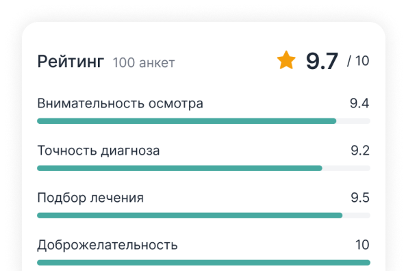 Уникальная оценка внимательности осмотра, точности диагноза, подбора лечения и доброжелательности врача